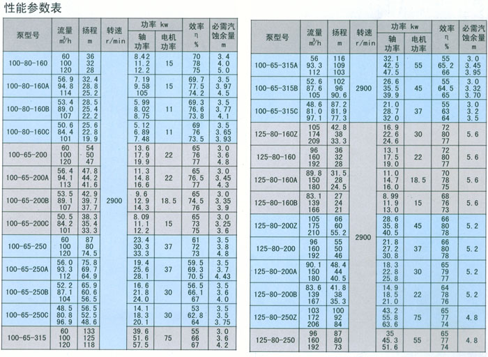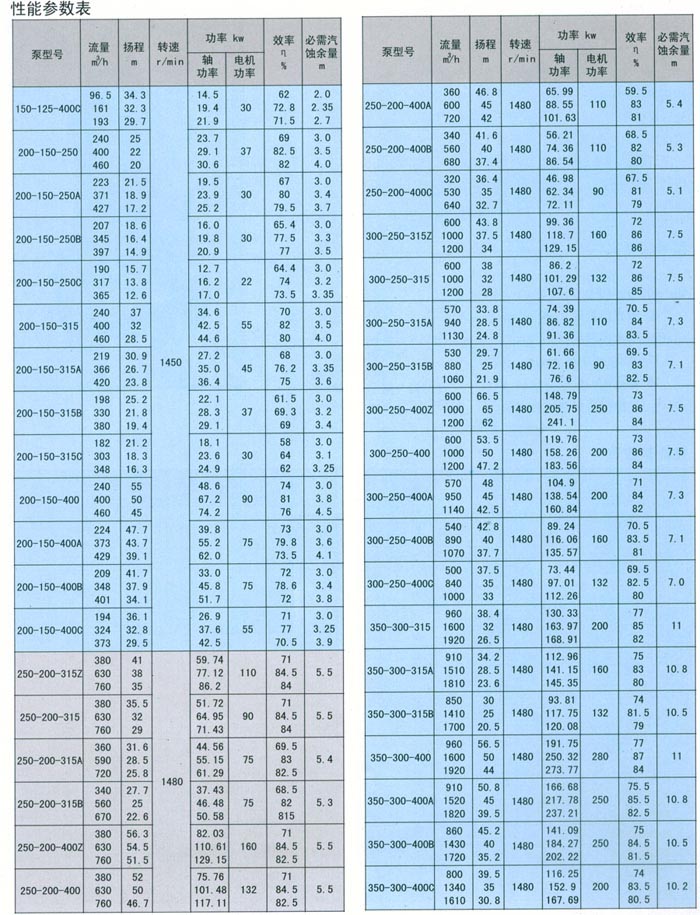 該型號(hào)泵的流量從100m%h至1920m%h揚(yáng)程從20. 5m至125m。該型泵的工作溫度為一10'C至80'C;泵的進(jìn)口壓力可達(dá)1.5MPa (15kg/cm)